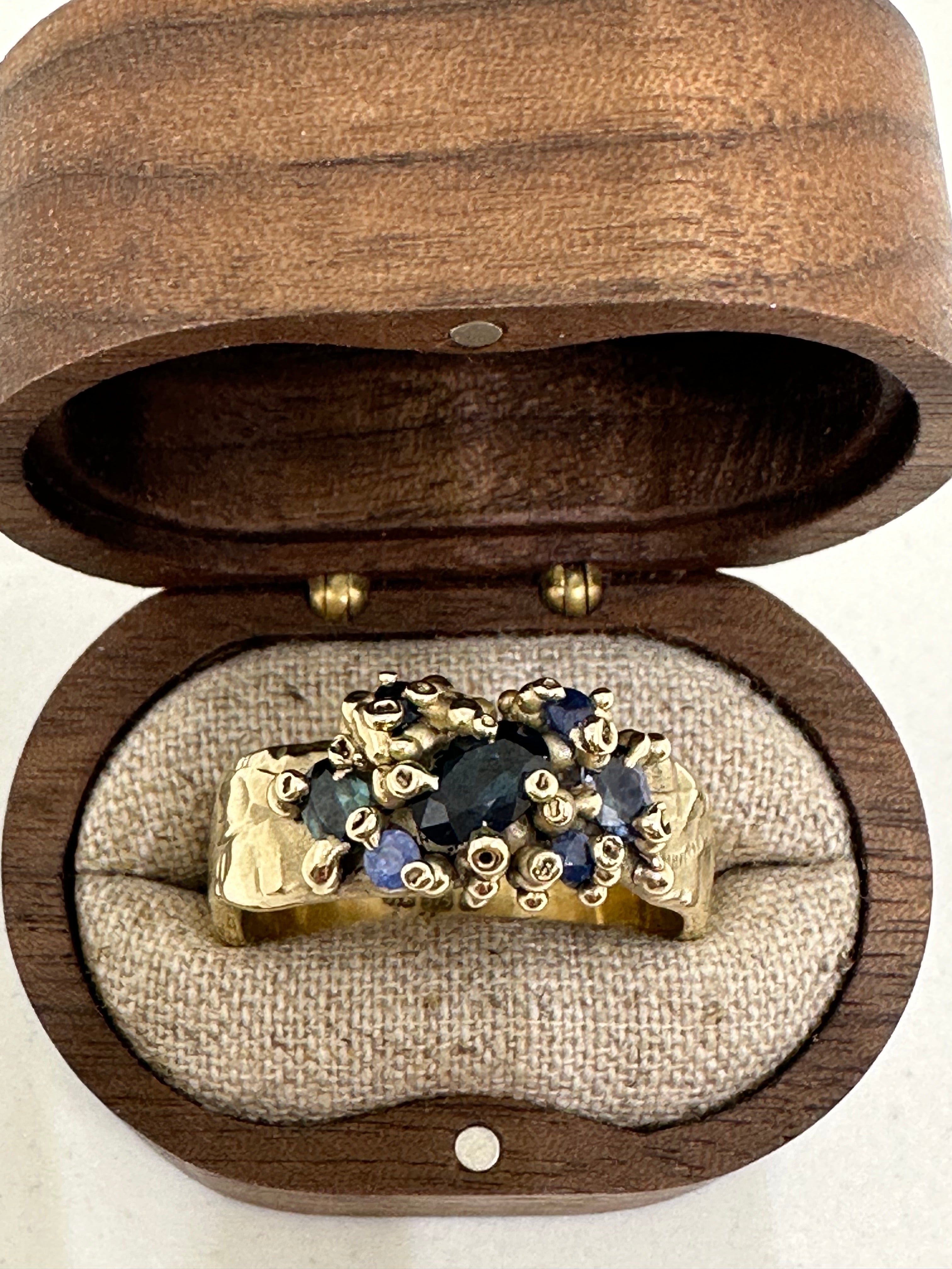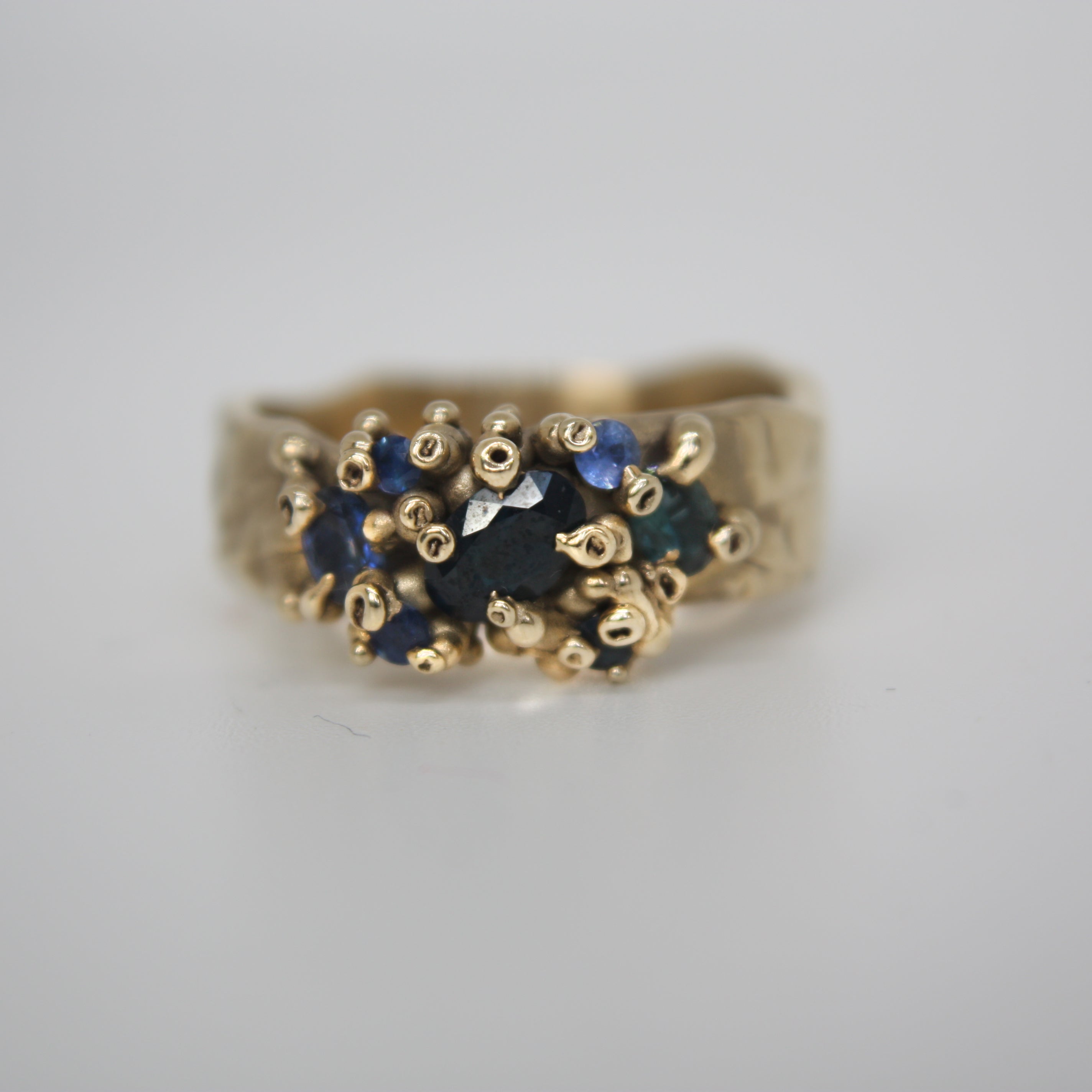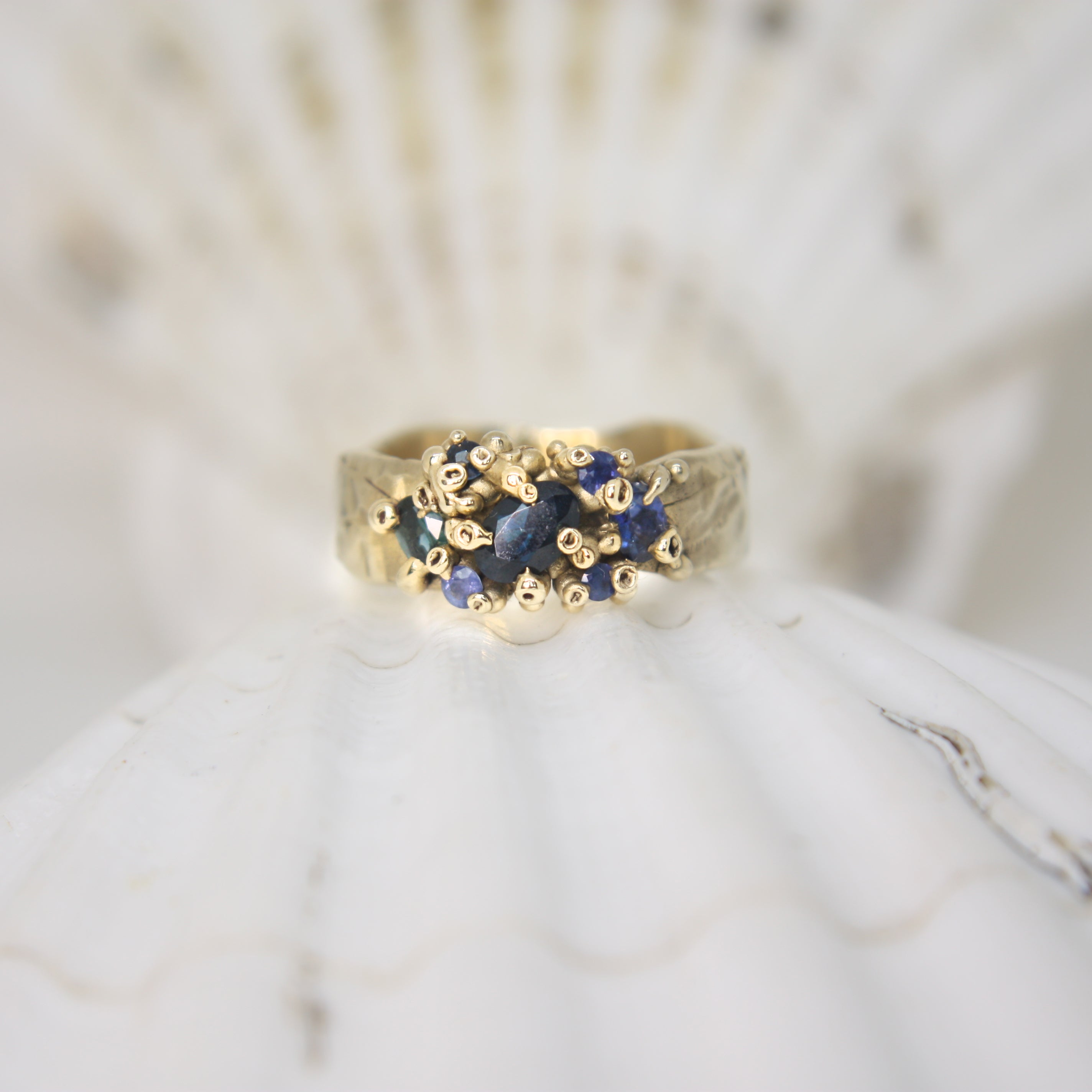 A stunning Australian sapphire takes centre stage in this piece, surrounded by a mix of smaller sapphires including some recycled stones, like blue and green pools between islands of 9ct yellow gold.