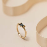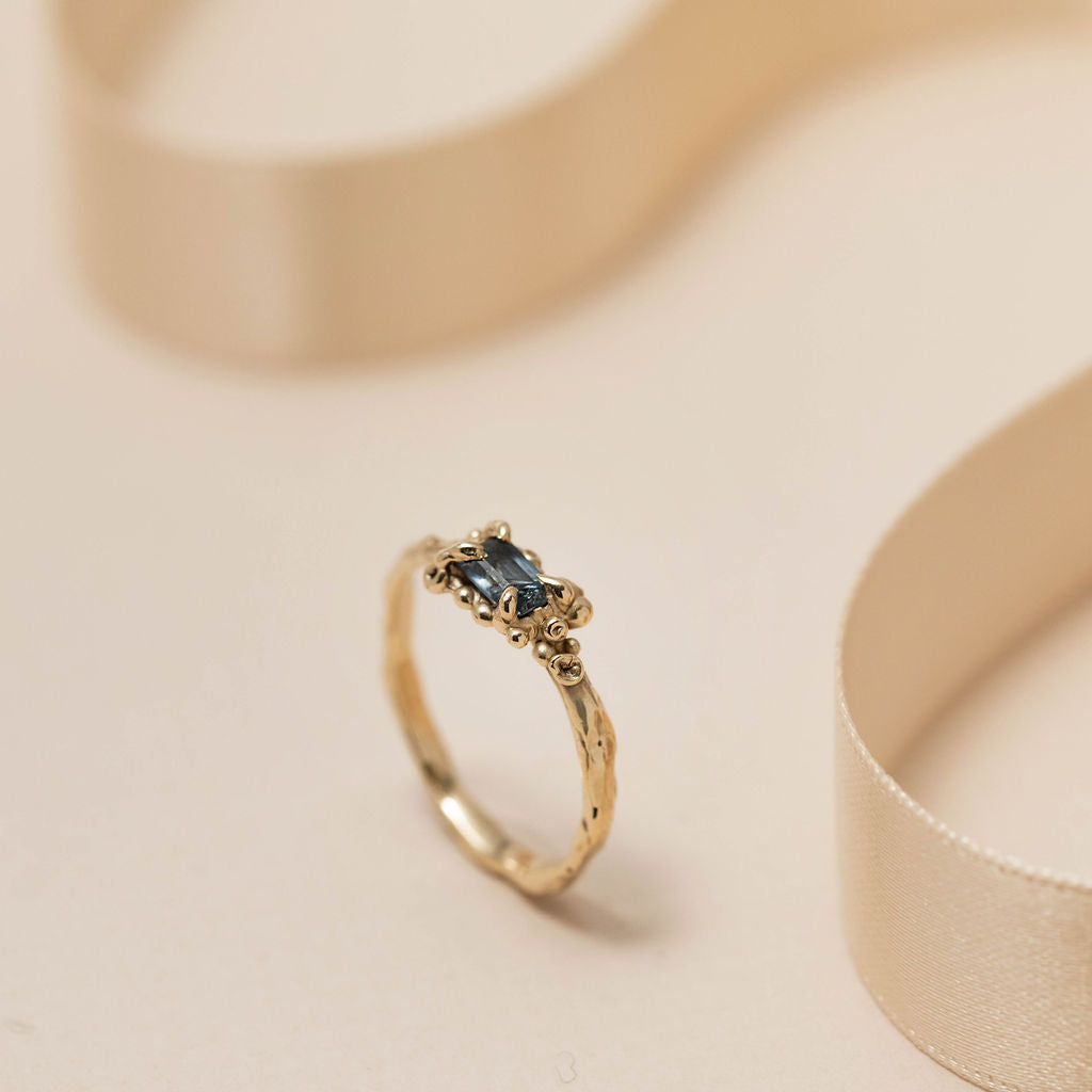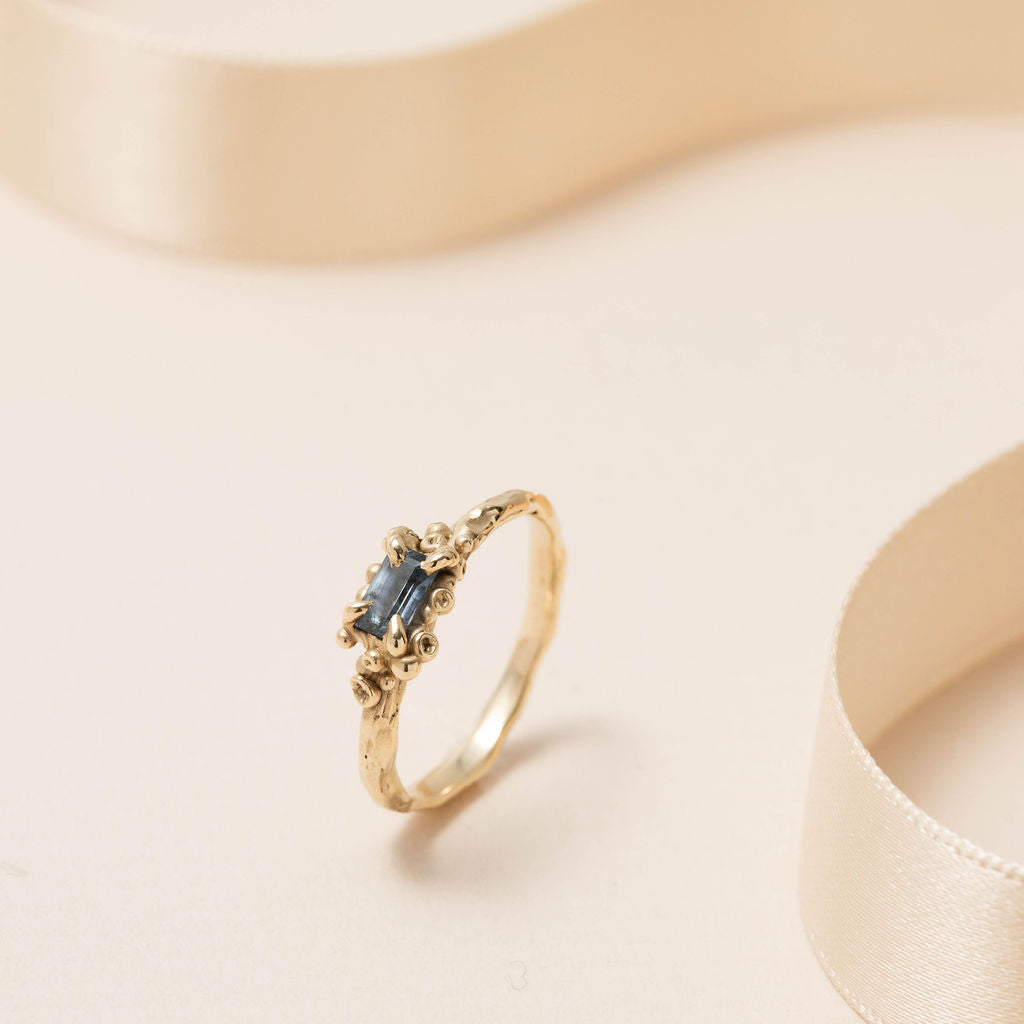 A stunning emerald cut sapphire pool surrounded by 9ct yellow gold golden sand in this One Of A Kind Treasure.